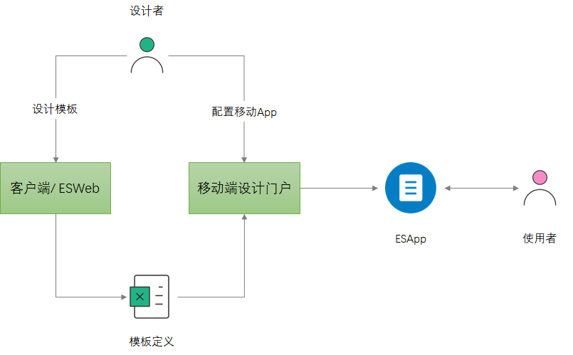 下面这个图,示意了勤哲移动应用的系统结构及运行原理。正如我们已经知道的,Excel服务器系统的用户分为设计者和使用者两类。设计者通过客户端或ESWeb设计好模板,然后通过”移动端设计门户“进行一些简单的配置(或者不做任何配置),使用者便可在移动设备上通过移动应用ESApp对系统进行操作。