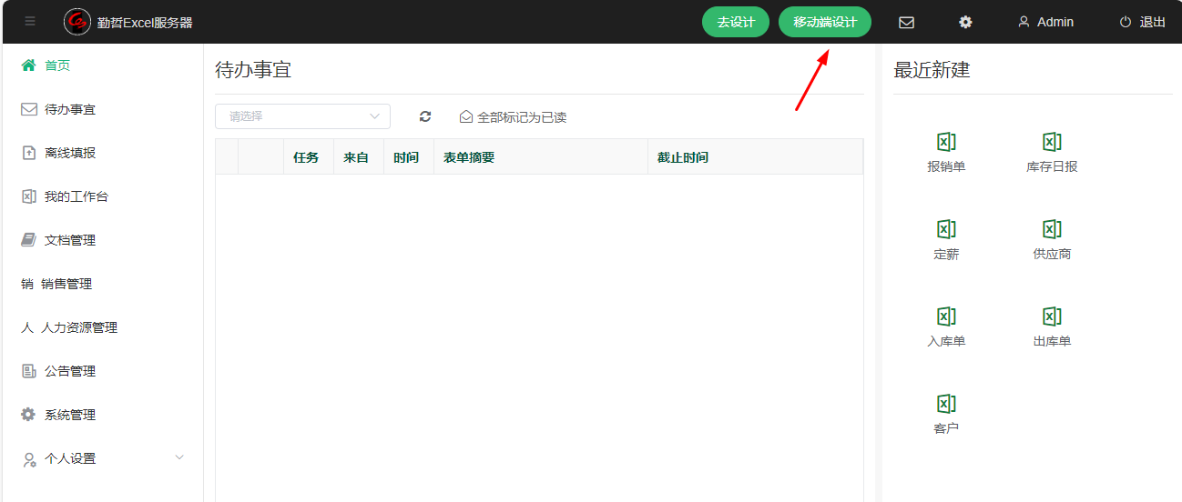 以管理员或设计者身份登录到 ESWeb,点击上方菜单栏中的【移动端设计】,便可进入移动端设计门户