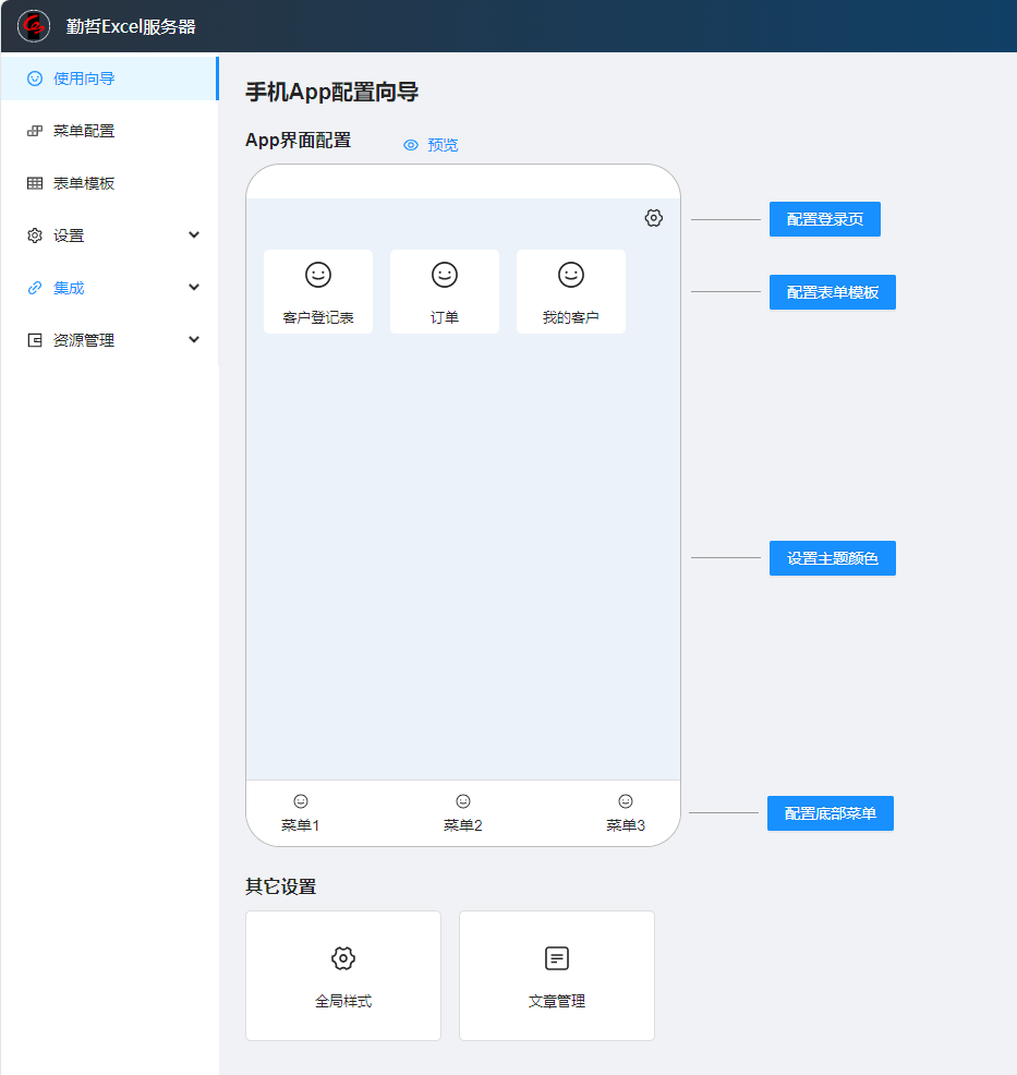 进入移动端设计门户,首先看到的是一个向导页面,显示一个模拟的手机屏幕的样子,通过此向导,可以分别进入对移动应用的各部分的配置,包括对登录页的配置,表单的配置,底部菜单的配置,设置主题样式等等,相应的功能同样也罗列与左侧的菜单中。在后面的课程中,我们会依次学习这些相应的配置操作。