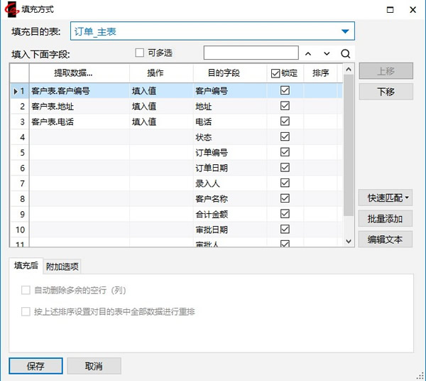 9.点击【填充方式】,出现“定义填充方式”窗口,填充数据表选择“订单_主表”,点击“地址”所在行的第一列编辑图标。
