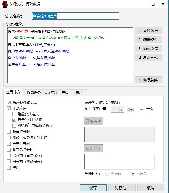 说明:【应用时机】中的【定时执行】勾选并设置【执行频率】后,在填报有此提数公式的表单时,每间隔设置的时间,则执行一次此提数公式。