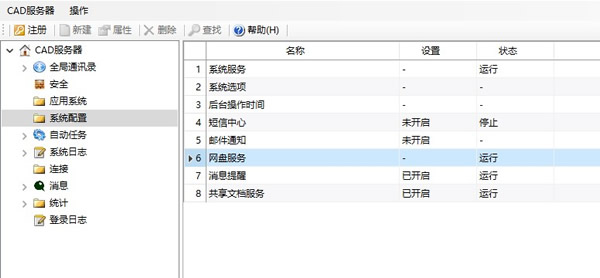 点击系统管理主窗口的“系统配置”节点,在右侧列表区列出了我们能够进行的各种配置管理工作,包括:配置系统服务的参数,管理服务的启动和停止;配置短信中心的参数,管理短信服务的启动和停止;配置邮件通知参数;配置消息提醒参数、服务的启动和停止;配置系统选项;设置后台操作时间间隔,网盘服务的配置、启动和停止;共享文档服务等等。