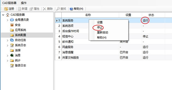 在系统管理台中,能看到系统服务的运行状态,如图。选中系统服务,可通过右键弹出菜单,对服务进行【停止】、【启动】或【重新启动】。