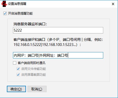 客户端连接IP和端口:如仅内网接收消息此输入框为空;若需要内、外网都接收消息则需在此处分别设置内、外网都可访问的服务器及端口。