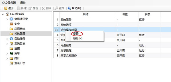在系统管理台主窗口上,左侧选中“系统配置”,右边选中“后台操作时间”,右键点击【设置】,如图