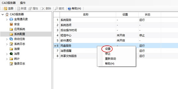 1.在系统管理台主窗口上,左侧选中“系统配置”,右边选中“网盘服务”,右键点击【设置】,如图