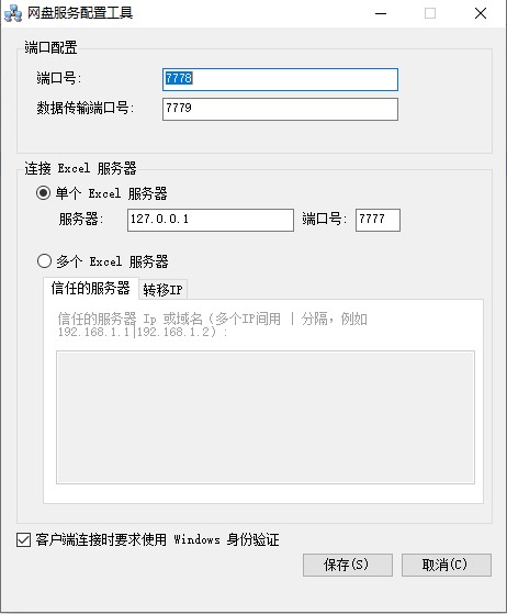 •若有多个Excel服务器其中一台做为网络文件服务器时,Excel服务器想访问网络文件服务器,则要在作为网络文件服务器的机器上设置【网盘服务配置工具】并且选择【多个Excel服务器】,将要访问网络文件服务器的Excel服务器IP地址进行输入。