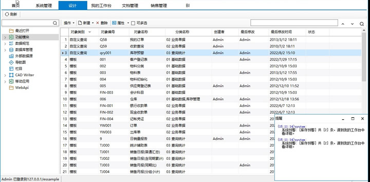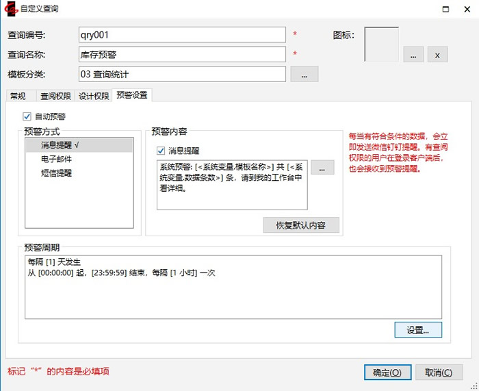 在第8章,我们学习过自定义查询,对于所有我们关心的关键指标,都可以设计相应的查询。针对自定义查询,可以做预警设置,即,系统在后台定时自动去做一下查询,查询无结果,则不做什么,若查询出了结果(相当于指标有异常了,或有需要处理的事项),则给相关人员发送提醒,提醒的方式,可以是电子邮件提醒、手机短信提醒、或系统中的弹窗提醒。
