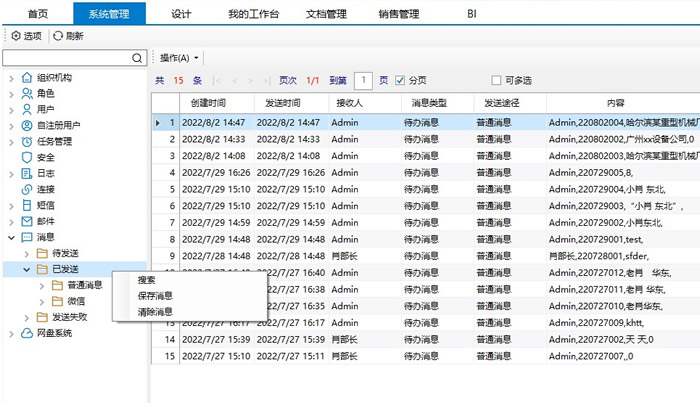 在客户端系统管理栏目中可查看本应用中发出的消息;在系统管理台中可查看所有应用发出的消息。