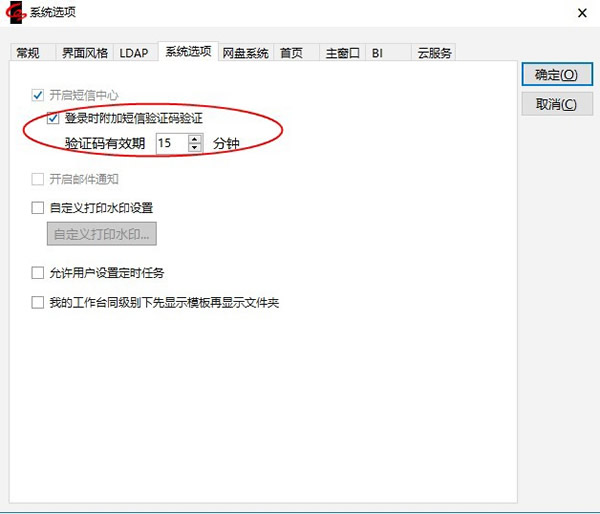 1.如下图所示:在【系统管理】-【选项】-【系统选项】选项卡中勾选【登录时附加短信验证码验证】并输入验证码有效期分钟数后,【确定】保存。