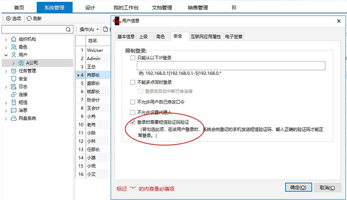 2.选中【系统管理】-【用户】在右侧用户明细中选中要使用验证码的用户点击属性,切换到【安全】选项卡并如图所示:勾选【登录时需要短信验证码验证】。