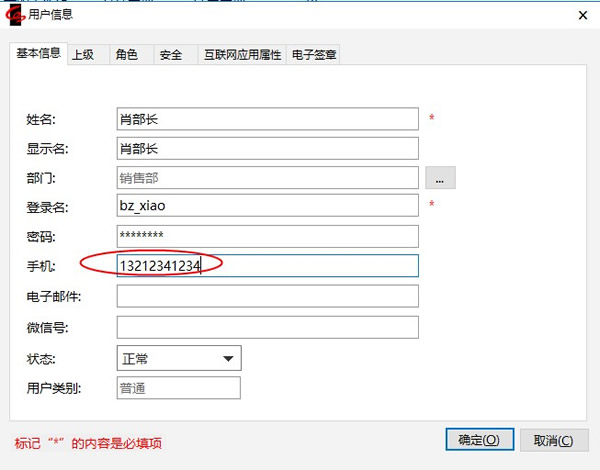 3.切换到【基本信息】选项卡,输入用户手机号。(在勾选登录时需要短信验证码验证后如用户无手机信息,无法保存设置)。