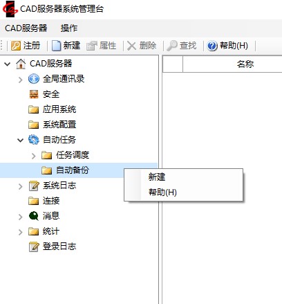 - 在左侧树型中展开“自动任务”,选中其下的“自动备份”,点击鼠标右键,选择弹出菜单“新建”。