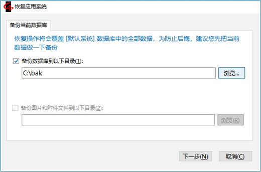 4.勾选【备份数据库到以下目录】并点击【浏览】选择备份当前数据库的目录,点击【下一步】。